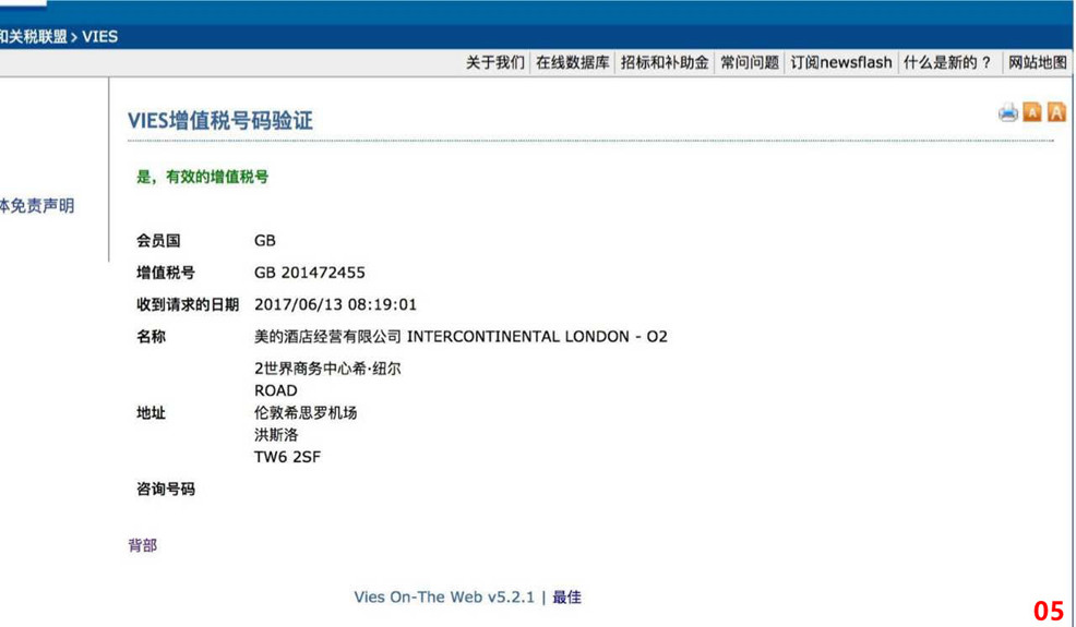 验证通过的VAT Number,系统将会显示该开票企业的相关注册资料: